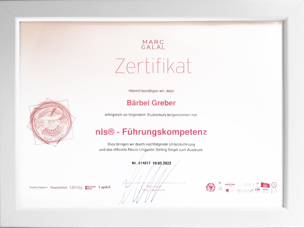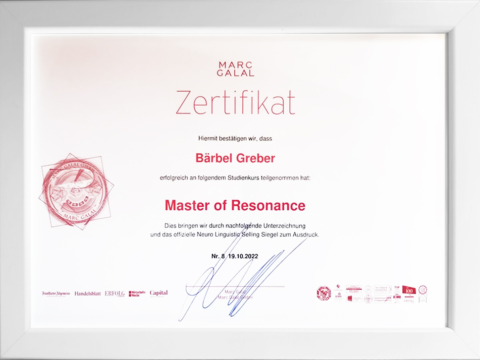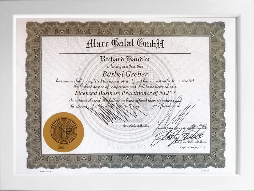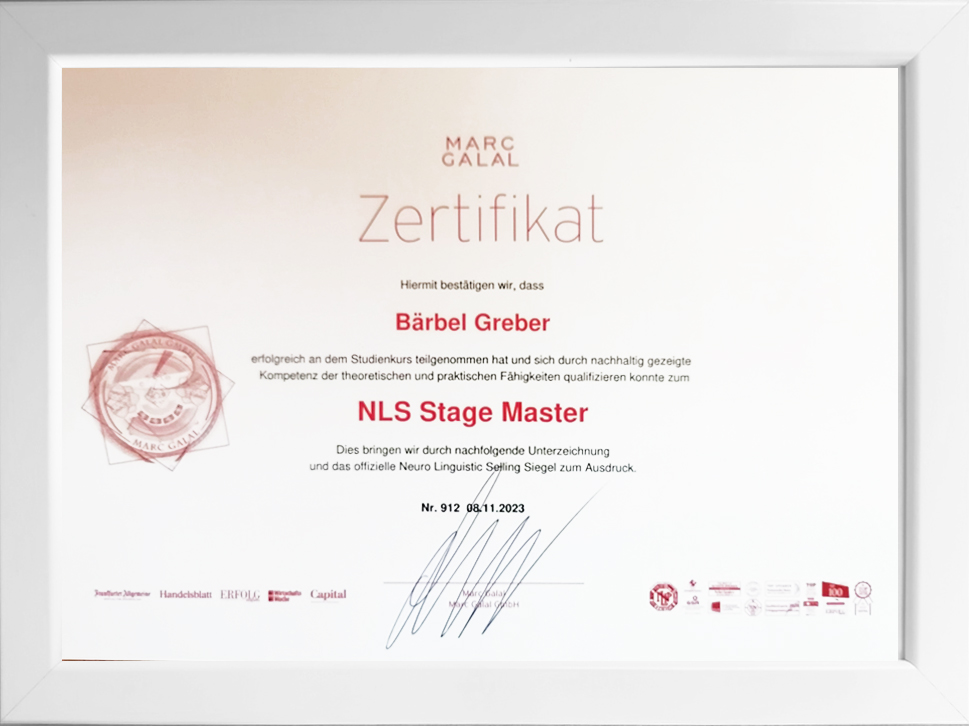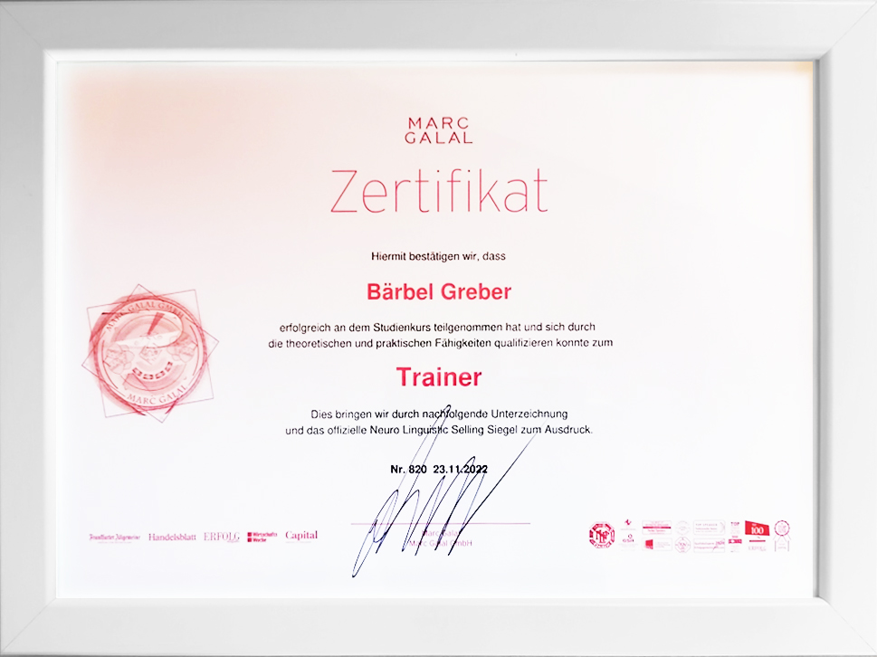 In ihrem reichhaltigen Portfolio finden sich Zertifizierungen wie Professional Neuro Linguistic Seller und Master, die sie zu einer versierten Verkaufs-Expertin machen. Durch Hypnose-Coaching und NLP-Zertifizierungen bei Dr. Richard Bandler gibt sie ihrem Repertoire eine tiefgehende Dimension. Zusätzlich ist sie Ausbildungs- und Coachpartnerin bei Marc Galal.